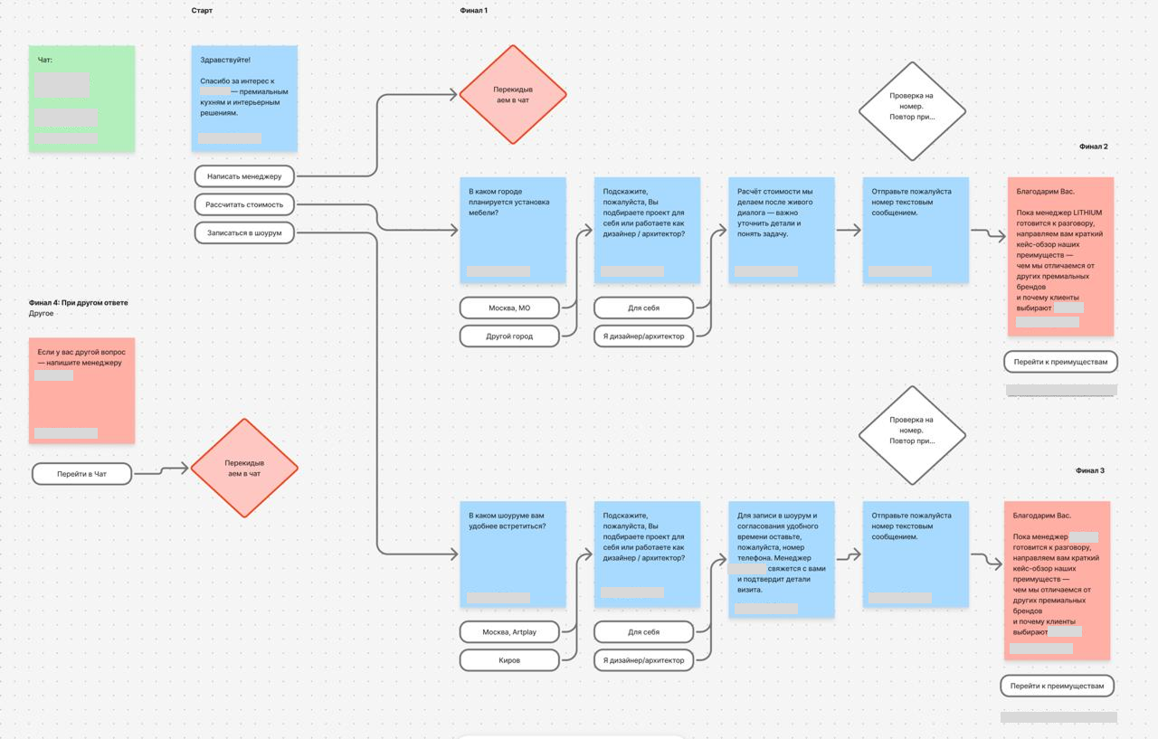 К нам обратился бренд премиальных кухонь на заказ с шоурумами в Кирове и Москве. Им нужен был Telegram-бот, который бы позволял записывать клиентов на просмотры в шоурумы и собирал заявки на расчет кухонь, а все другие вопросы перенаправлял менеджеру.