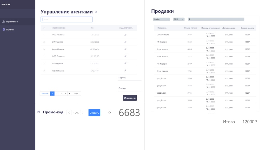 Панель управления (админка) предназначалась исключительно для внутреннего использования. В ней агенты могли просматривать все оформляемые полисы, управлять договорами и видеть активность по каждому продукту — больше никаких прыжков между разными системами.