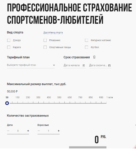 А для обычных людей мы разработали фронтальную часть: понятные калькуляторы, где можно выбрать вид спорта, тарифный план, срок страховки и сразу получить стоимость.