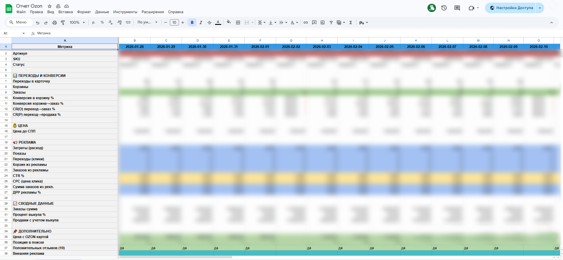 Решили проблему с ограничениями Ozon. Часть метрик (переходы в карточку, корзины) недоступна по API с обычной подпиской «Премиум». Мы оставили эти ячейки пустыми, и клиент теперь сам решает, вносить ли их вручную или перейти на другой тариф ради аналитики.