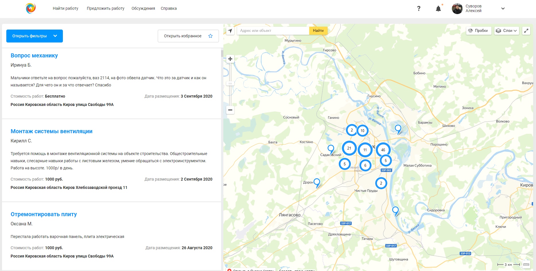 - вывод заявок на карте;