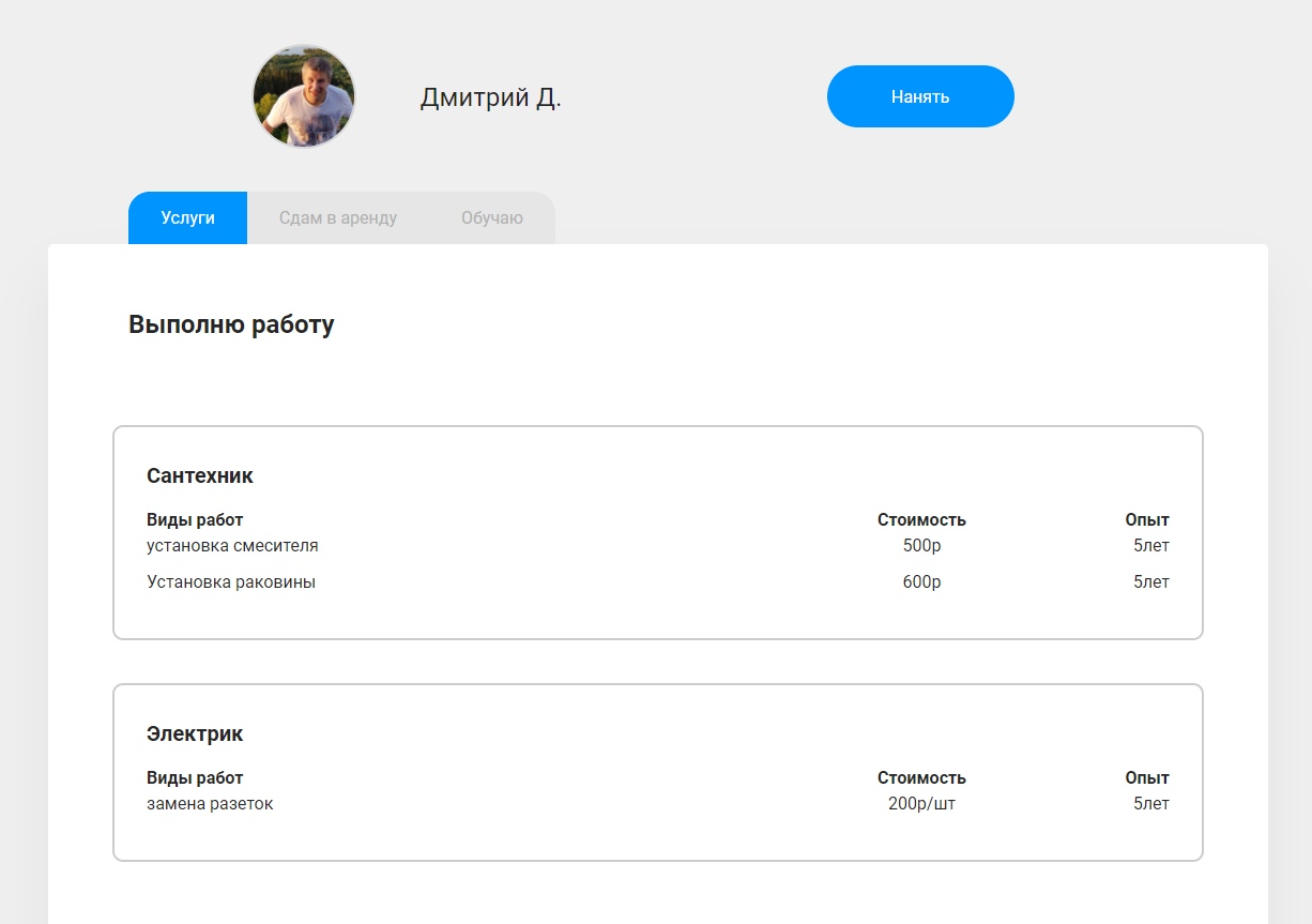 - профили пользователей с информацией о предлагаемых услугах и отзывами;